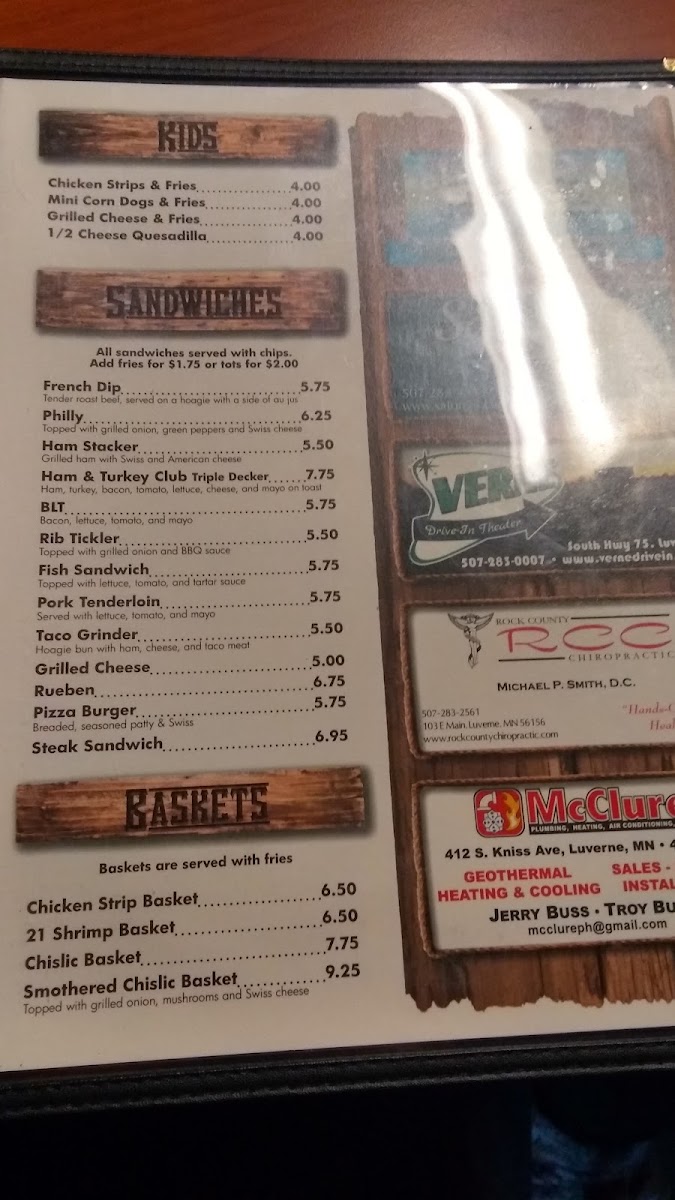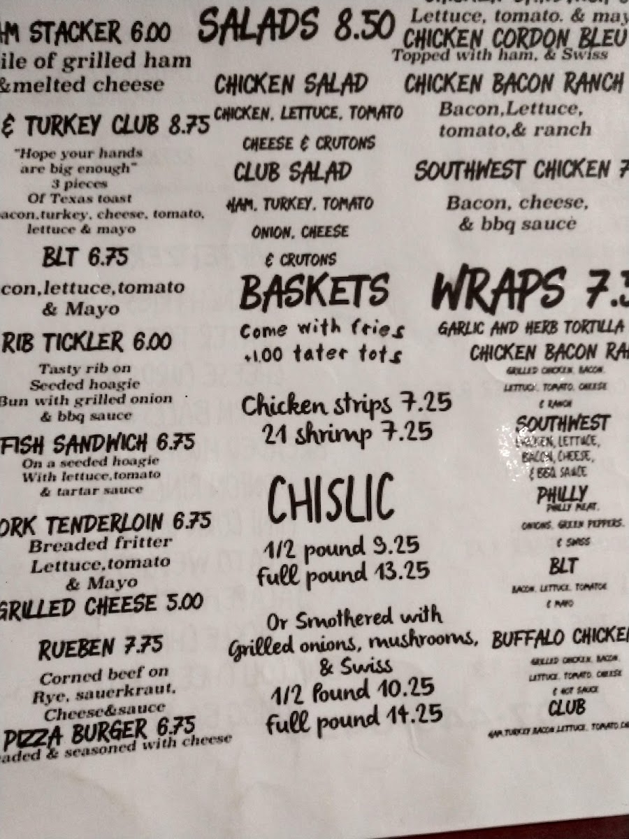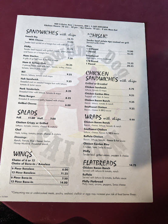 Guests can expect hearty sandwiches like the Philly Cheese Steak or a BLT, alongside local staples such as the popular Chislic served plain or with savory toppings. Burgers play a central role here, with options ranging from the Mushroom & Swiss Buffalo Burger to creative takes like the Vircalicious Burger with tots. For lighter moments or a side to share, the menu includes salads and crisp fried sides like crinkle-cut fries or seasoned tater tots.